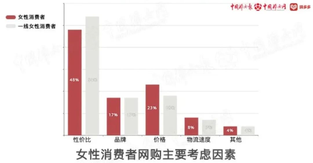 “都市女性反而更看重性價比,七成女性消費者會邀請朋友一起拼團購買”,通過對平臺5.36億消費者的消費數據分析和問卷調研,這份名為《新電商平臺上的女性》的數據報告指出,在網上,93%的女性用戶曾有主動分享商品給好友以共同拼團的行為;近五成女性消費者將性價比列為購物的第一考慮因素。
