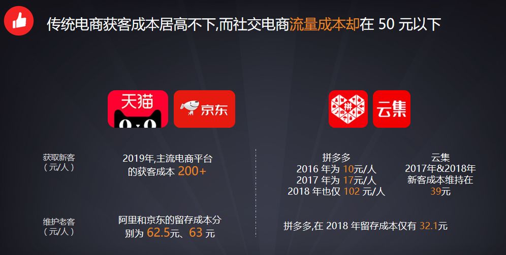 隨著人口紅利、傳統電商流量紅利的消失,獲客成本越來越高昂,商家如何挖掘新機會獲取增長?有贊學院院長閆冬表示在私域流量化已成定局,在社交新零售時代,商家要不斷深耕私域流量、精準借勢及場景延伸,才能帶來更大的價值。以下為精彩演講內容: 今天跟大家聊一下2020年以及未來幾年都不能錯過的事情——私域流量,私域流量更多是培養我們自己的超級用戶,服務好他們才能帶來更多的客戶。 近年來線上電商獲客成本逐年升高,線上流量紅利逐漸消減,線上零售企業開始積極向線下滲透以挖掘流量入口。傳統電商獲客成本居高不下,而社交電商流量成本卻在50元以下。2019年,主流電商平臺的獲客成本200+元/人,其中阿里和京東的留存成本分別為62.5元、63元。大家可以看到這個流量成本非常貴;再看社交型電商平臺,拼多多2018年獲客成本102元/人,其留存成本為32.1元,而云集2017&2018年新客成本維持在39元。
