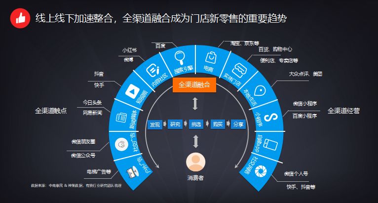 3、線上線下加速整合,全渠道融合成為門店新零售的重要趨勢。未來線上線下經營的是同樣一群人,賣的是同樣一批貨,只不過用了不同的營銷方式而已。看到這張圖的時候,不知道大家有沒有找到切入點,找到適合你自己的那個是最重要的。