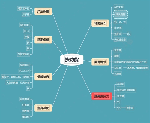 如果按劑型來做劃分的話,有粉劑、滴劑、片劑和膠囊。粉劑里面有調制乳粉和固體飲料。片劑和膠囊,如果不是藍帽子,不是保健食品的話,這兩種劑型是不允許在普通食品里面出現的,所以就會派生出另外兩種劑型,叫壓片糖果和凝膠糖果。壓片糖果、凝膠糖果和固體飲料都有一個要求,必須要有糖的成分在里面。 下面是按功能來做的營養品劃分,也是營養品優化策略的重點。左右兩邊是根據人群來劃分。