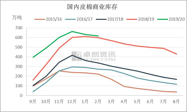 春節(jié)后受公共衛(wèi)生事件影響,市場(chǎng)對(duì)于全球棉花(12325, -100.00, -0.80%)消費(fèi)預(yù)期下滑,棉花市場(chǎng)巨震,鄭棉最大跌幅達(dá)10.4%。雖下游紡織、服裝企業(yè)陸續(xù)復(fù)工,但短期棉花需求尚處于弱勢(shì),且市場(chǎng)情緒低迷,棉價(jià)上漲缺乏有效驅(qū)動(dòng),預(yù)計(jì)短期或延續(xù)低位震蕩走勢(shì)。 高庫存壓力對(duì)棉價(jià)反彈空間形成限制