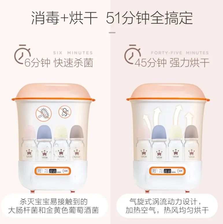 與此同時,該款產品還采用智能化技術升級吸奶器的吸力,模仿寶寶吸吮習慣,具備10檔變頻調節功能,并且還有記憶功能,每次打開后都會精準呈現上次吸乳的數據。其中,獨有的催乳+吸乳兩種模式,催乳時主要是利用淺力按摩進行泌乳,吸乳時利用不斷加深的力度,增加吸力、迅速引出乳汁,實現舒適快速的吸乳效果。 突破寶寶消毒產品單一化缺陷,智能烘干功能疊加 Combi康貝多功能嬰兒奶瓶消毒鍋一鍵按壓就可實現6分鐘快速消毒,滅殺寶寶易接觸到的大腸桿菌和金黃色葡萄酒菌。而定時10—45分鐘就可強力烘干,利用氣旋式渦流動力設計加熱空氣,采用熱風均勻烘干。定時51分鐘,就可實現消毒+烘干一體的功能疊加,突破以往寶寶消毒產品單一化的缺陷。
