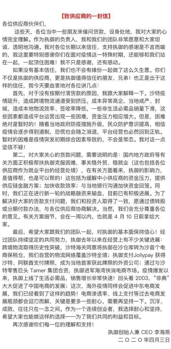 4月4日,中東電商平臺(tái)執(zhí)御創(chuàng)始人兼CEO李海燕針對(duì)諸多供應(yīng)商催問貨款問題發(fā)表公開信。對(duì)于沒有按期付清供應(yīng)商的貨款,李海燕在“致供應(yīng)商的信”中表示,執(zhí)御愿通過債轉(zhuǎn)股或分期付款辦法的方法,與供應(yīng)商協(xié)商解決,并且會(huì)在4月10日前給到有關(guān)方案細(xì)節(jié)。