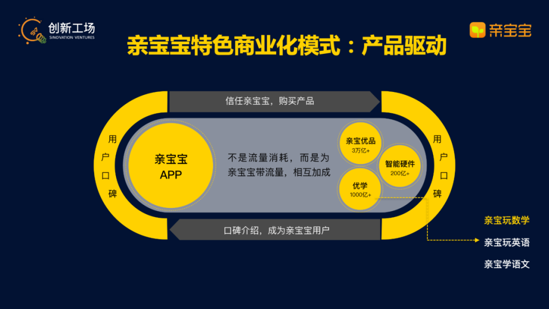 親寶寶的商業模型可以稱之為“以產品為驅動的非線性增長的模式”。簡單地說就是有了親寶寶APP這個產品后,因為用戶的信任、口碑自然而然地構建了一個比較大的流量池。而我們又精心提供實物商品、智能硬件和數學啟蒙早教等產品,幫助用戶完成整個教育和育兒的過程。這些好的產品,如果用戶認可,會成為正向的口碑,最終形成親寶寶整體的一個場景品牌。所以我一直在強調親寶寶不僅僅只是一個APP,也不僅僅只是做早教產品的一家公司,我們最終希望構建的商業形態是為用戶解決家庭育兒問題的一個場景性品牌。 做這樣一個場景品牌,核心要解決用戶的育兒問題,幫助用戶更好地育兒。所以我們內部一直強調用戶價值、用戶體驗,以及可能產生的口碑效應。最終我們所有的服務和產品,會構成一個完整的用戶品牌認知,實現最大化挖掘每一個用戶的價值。這是我們商業模型的一個優勢。 |