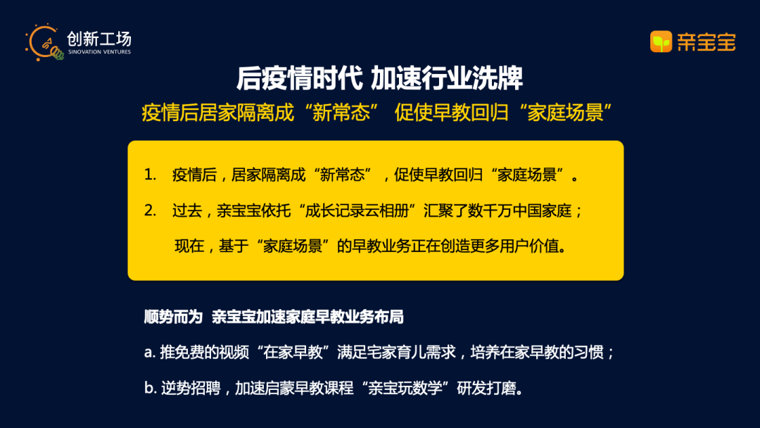 馮培華認為,“疫情在一定程度上改變了人的思維和行為習慣。疫情后,家庭場景被用戶群更加看重。尤其是早教,疫情發生后,居家隔離成為新常態,這其實也促使早教回歸‘家庭場景’。這一點,從親寶寶近兩個月的數據表現也能佐證。” 不過,從公司業務發展角度,馮培華則表示,“不要被短期趨勢影響長遠判斷以及業務發展——現階段突然的新增流量或者某個模塊的極速增長,不能作為馬上加大力量去投入的參考依據。長期來看,企業還是要把產品做好,好的產品一定是為用戶帶來價值的,一旦有了價值,用戶就會給出好的反饋和口碑。 關于后疫情時代的企業發展,馮培華表示親寶寶在細分領域已處于絕對頭部的位置,公司在過去的兩年中,通過親寶寶APP、自有品牌電商、廣告、教育等業務,形成了閉環商業模型。他認為,親寶優品與早教方向,是巨大的賽道,因此未來不會擴充細分領域,而是把已有的方向做強做好。關于人才,馮培華表示,親寶寶目前在實物商品、教育這兩個方向大規模地招募優秀人才。當前受疫情影響,很多公司釋放出不少優秀人才,親寶寶正在加快招聘進程,加緊吸收人才。 以下是親寶寶馮培華的演講精選實錄: 疫情會加速行業的洗牌。同時,疫情也會改變用戶的一些行為習慣,家庭這個場景會被用戶群更加看重。疫情讓用戶進一步接受了“在家早教”這個概念。面對疫情帶來的機遇,企業需要做好產品,并構建自己的服務能力,才能抓住機會往前沖。而親寶寶在這方面一直做的不錯。