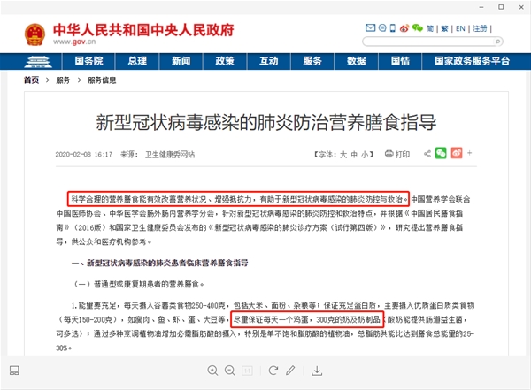 中華人民共和國中央人民政府網(wǎng)站、國家衛(wèi)健委官網(wǎng)發(fā)布的《新型冠狀病毒感染的肺炎防治營養(yǎng)膳食指導》中明確指出,“科學合理的營養(yǎng)膳食能有效改善營養(yǎng)狀況、增強抵抗力,有助于新型冠狀病毒感染的肺炎防控與救治。”以及“盡量保證每天一個雞蛋,300克的奶及奶制品”,文件旨在通過科學合理的營養(yǎng)來提升人體的免疫狀況,增強對疾病的抵御能力。