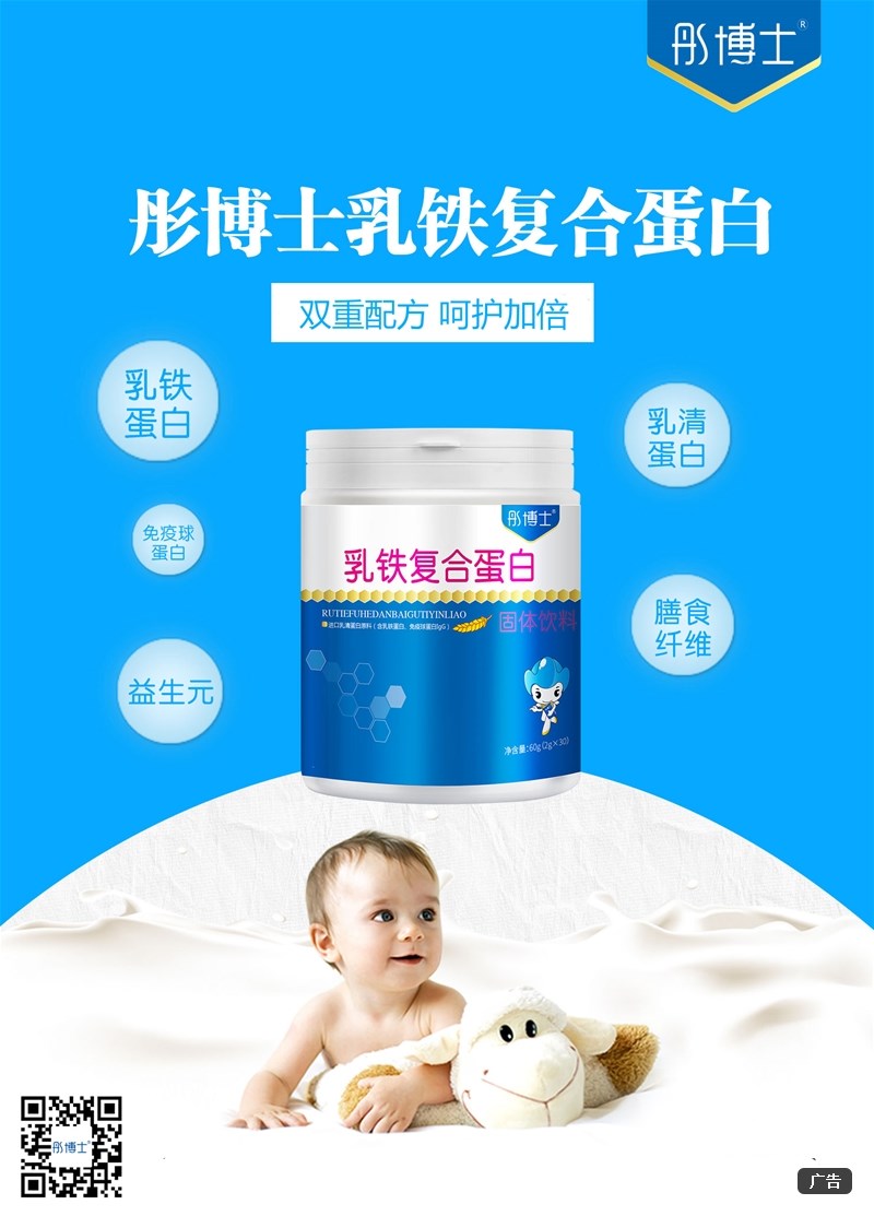 彤博士乳鐵復合蛋白產品特點: 1、進口乳清蛋白,含量高達35%,品質純正有保障; 2、“乳鐵+免疫球蛋白”雙重配方,呵護加倍;