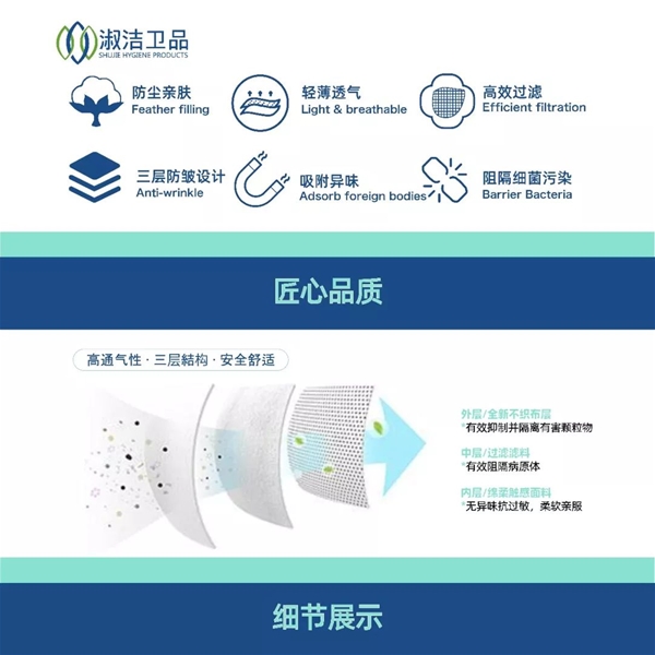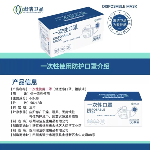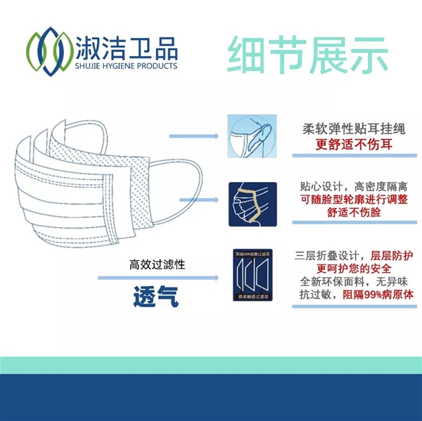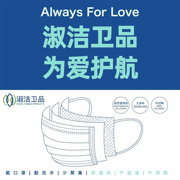 淑潔衛品二十年專注衛品護理,老品牌,可信賴。這次更是積極響應全民抗“疫”的號召,開發投產全新產品一次性口罩。