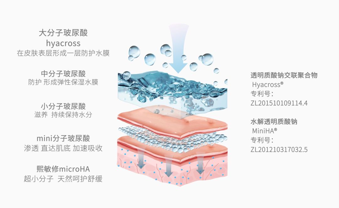 同是玻尿酸 潤熙禾玻尿酸有何不同? 我們的皮膚有一層保護網—角質層,它可以阻隔多數外來物,保護人體不受外界侵害。常規護膚品中的玻尿酸是中分子,它的體積過大穿不透角質層,也就無法被皮膚吸收。潤熙禾產品中的玻尿酸同時含大中小分子和mini分子。