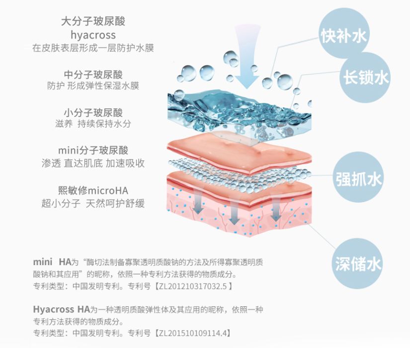 其中的熙敏修,這個小家伙值得我們來好好念叨念叨。它屬于華熙生物研發(fā)的最小分子的透明質酸,采用專利酶切工藝,突破性分子量(≤5KDA),能迅速穿透肌膚表層,深入直達肌底,和其他的玻尿酸成分相比他的透皮吸收率真的hin高!