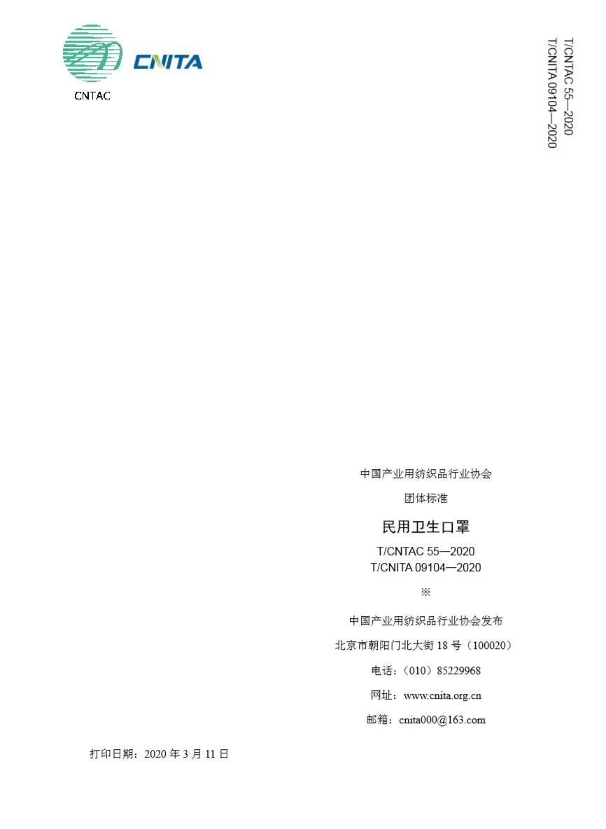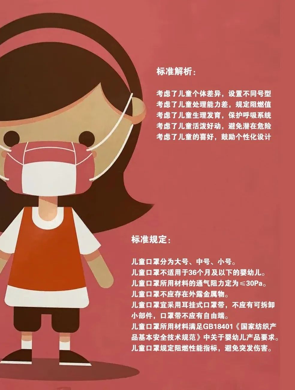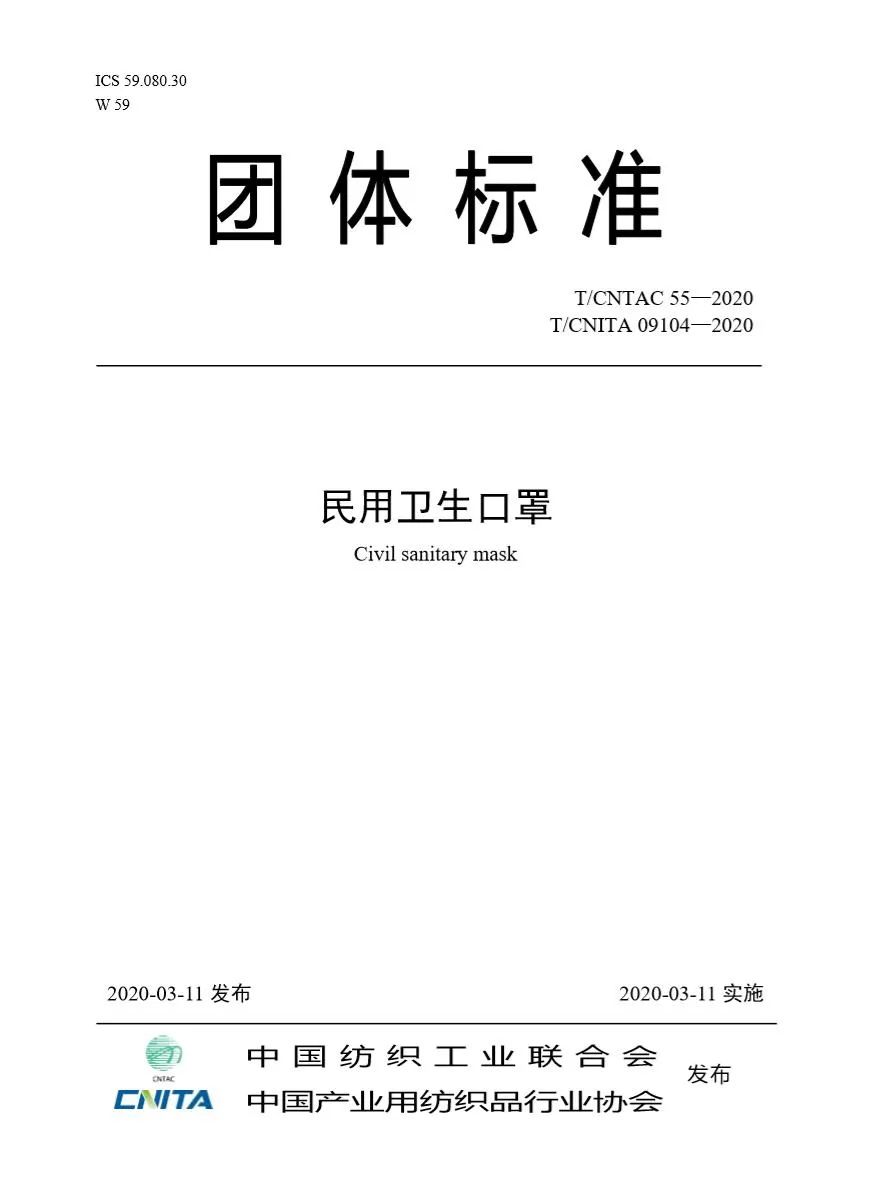 為什么要做《民用衛(wèi)生口罩》? 疫情期間,口罩需求急劇增加,出現(xiàn)了民用口罩企業(yè)采標亂、市場監(jiān)管難、消費者無從辨別等一系列新問題。 目前國家相關(guān)口罩標準中沒有對兒童口罩進行專門規(guī)定,疫情期間兒童應該選用什么樣的口罩,也成為社會焦點所在! 現(xiàn)有口罩標準 民用防護型口罩標準:GB/T 32610—2016 《日常防護型口罩技術(shù)規(guī)范》,GB 2626—2006《呼吸防護用品自吸過濾式防顆粒物呼吸器》,主要適用于顆粒物防護,在本次疫情中發(fā)揮了重要作用,但是復工復產(chǎn)中大量使用了阻隔型口罩(平面型口罩為主),無法滿足上述兩個標準要求。 醫(yī)用領(lǐng)域標準:GB 19083—2010《醫(yī)用防護口罩技術(shù)要求》、YY 0469—2011《醫(yī)用外科口罩》、YY/T 0969—2013《一次性使用醫(yī)用口罩》,主要適用于醫(yī)療領(lǐng)域。 《民用衛(wèi)生口罩》制定過程 1、立項準備階段 口罩需求量上漲,標準遇到新問題。 為滿足疫情緊急情況下民眾對口罩的需求、轉(zhuǎn)產(chǎn)口罩企業(yè)的采標,保證產(chǎn)品質(zhì)量和市場監(jiān)管,中國產(chǎn)業(yè)用紡織品行業(yè)協(xié)會提出立項申請,快速起草《衛(wèi)生用口罩》團體標準。 2、標準起草階段 2月25日編制計劃下達。中國產(chǎn)業(yè)用紡織品協(xié)會成立標準起草小組,在前期行業(yè)調(diào)研的基礎(chǔ)上,對標分析、重點討論,確定框架,編制標準,并根據(jù)標準適用性將標準名稱變更為《民用衛(wèi)生口罩》。 2月28日完成標準征求意見稿。 3、征求意見階段 3月4日,標準完成征求意見稿的社會意見征求,共收到意見103 條,其中采納34 條,部分采納23 條。起草組進一步完善標準,形成送審稿和編制說明。 4、標準報批階段 中紡聯(lián)和中產(chǎn)協(xié)標委會分別對標準送審稿進行函審,起草組根據(jù)函審意見,再次完善標準文本和編制說明,形成報批稿。 5、標準發(fā)布 3月11日,T/CNTAC 55—2020、T/CNITA 09104—2020《民用衛(wèi)生口罩》標準發(fā)布。 《民用衛(wèi)生口罩》使用場景 本標準適用于日常環(huán)境中普通人群用于阻隔飛沫、花粉、微生物等顆粒物傳播的民用衛(wèi)生口罩。 本標準圍繞口罩應具備的功能及佩戴安全性設(shè)定指標,主要包括材料及佩戴安全性、必要的阻隔功能,并且特別關(guān)注佩戴舒適性。 《民用衛(wèi)生口罩》的主要內(nèi)容 13項標準指標為口罩性能保駕護航: 適合復工復學佩戴,可有效阻隔飛沫、花粉、微生物等顆粒物傳播; 分為成人口罩和兒童口罩,規(guī)格分別為大號(L)中號(M)小號(S); 明確佩戴的安全性和材料,不應存在可觸及的銳利尖端和銳利邊緣,兒童用口罩宜采用耳掛式口罩帶,不應有可拆卸小部件等,兒童口罩帶不應有自由端,口罩原材料不應使用再生料,口罩與皮膚直接接觸材料不得染色等; 突出口罩阻隔功能,細菌過濾效率不低于95%,顆粒物過濾效率不低于90%; 突出口罩佩戴舒適性,成人用口罩通氣阻力定為≤49Pa,兒童用口罩通氣阻力定為≤30Pa; 并且明確規(guī)定了環(huán)氧乙烷殘留量、耐干摩擦色牢度、甲醛含量、pH值、可分解致癌芳香胺染料、微生物指標、阻燃性能等指標; 兒童口罩有要求: