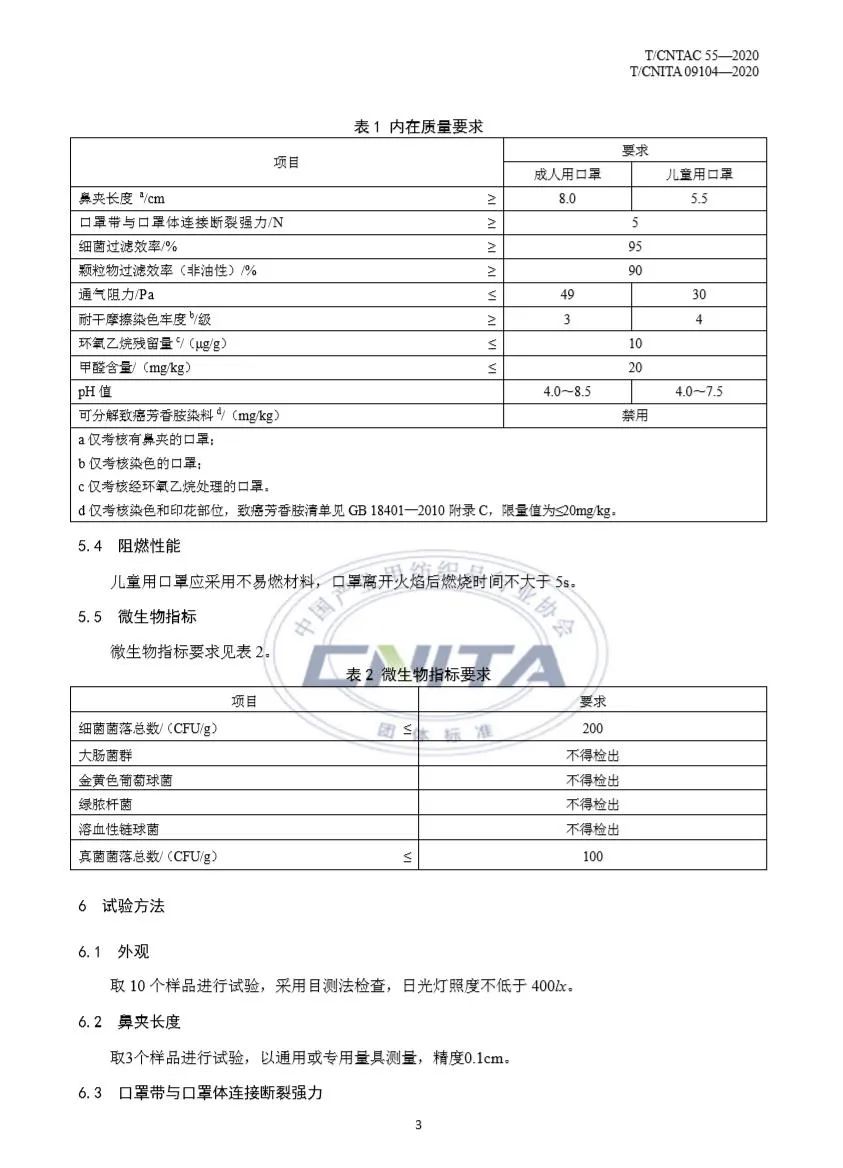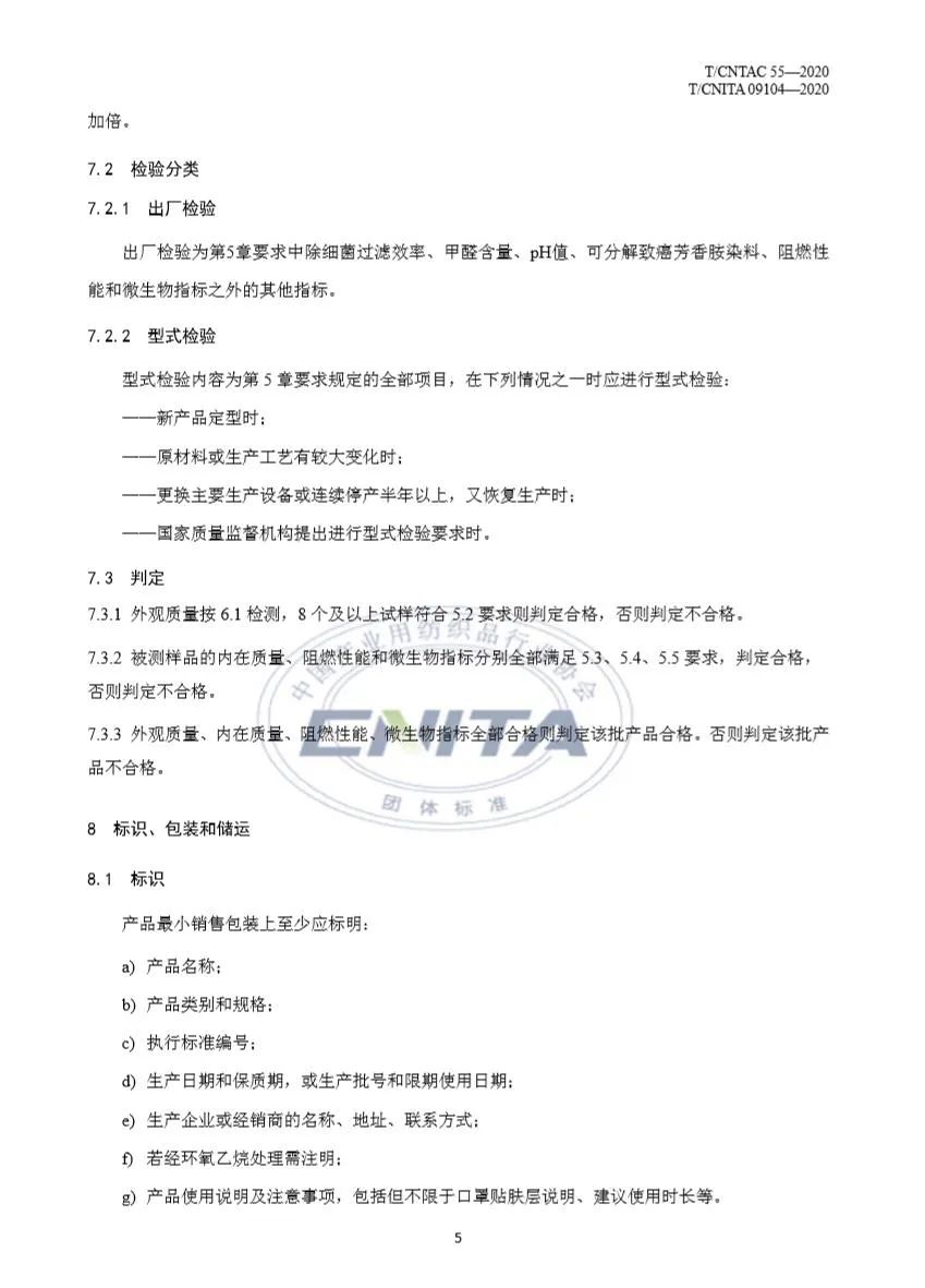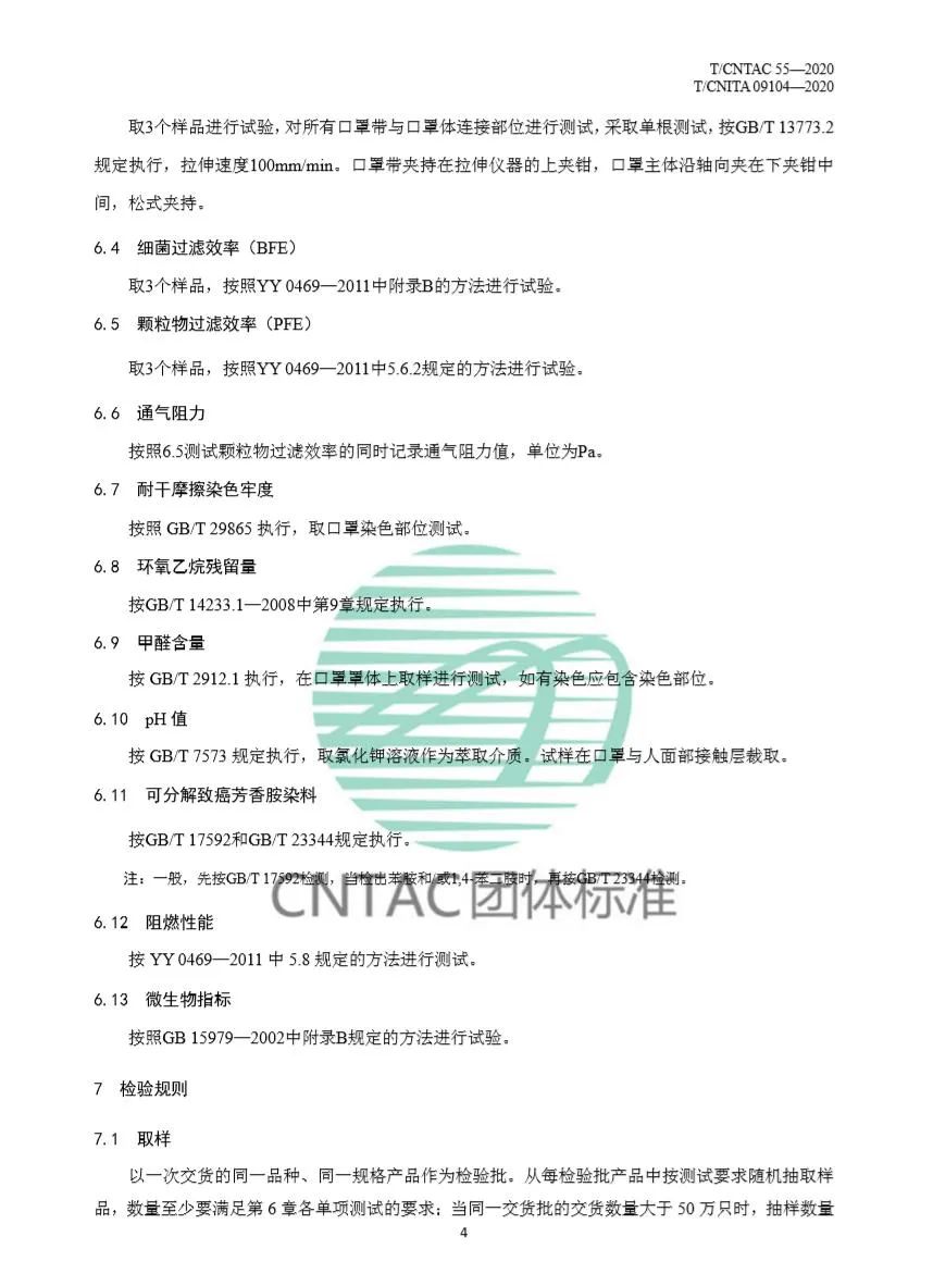 為什么要做《民用衛(wèi)生口罩》? 疫情期間,口罩需求急劇增加,出現(xiàn)了民用口罩企業(yè)采標亂、市場監(jiān)管難、消費者無從辨別等一系列新問題。 目前國家相關(guān)口罩標準中沒有對兒童口罩進行專門規(guī)定,疫情期間兒童應該選用什么樣的口罩,也成為社會焦點所在! 現(xiàn)有口罩標準 民用防護型口罩標準:GB/T 32610—2016 《日常防護型口罩技術(shù)規(guī)范》,GB 2626—2006《呼吸防護用品自吸過濾式防顆粒物呼吸器》,主要適用于顆粒物防護,在本次疫情中發(fā)揮了重要作用,但是復工復產(chǎn)中大量使用了阻隔型口罩(平面型口罩為主),無法滿足上述兩個標準要求。 醫(yī)用領(lǐng)域標準:GB 19083—2010《醫(yī)用防護口罩技術(shù)要求》、YY 0469—2011《醫(yī)用外科口罩》、YY/T 0969—2013《一次性使用醫(yī)用口罩》,主要適用于醫(yī)療領(lǐng)域。 《民用衛(wèi)生口罩》制定過程 1、立項準備階段 口罩需求量上漲,標準遇到新問題。 為滿足疫情緊急情況下民眾對口罩的需求、轉(zhuǎn)產(chǎn)口罩企業(yè)的采標,保證產(chǎn)品質(zhì)量和市場監(jiān)管,中國產(chǎn)業(yè)用紡織品行業(yè)協(xié)會提出立項申請,快速起草《衛(wèi)生用口罩》團體標準。 2、標準起草階段 2月25日編制計劃下達。中國產(chǎn)業(yè)用紡織品協(xié)會成立標準起草小組,在前期行業(yè)調(diào)研的基礎(chǔ)上,對標分析、重點討論,確定框架,編制標準,并根據(jù)標準適用性將標準名稱變更為《民用衛(wèi)生口罩》。 2月28日完成標準征求意見稿。 3、征求意見階段 3月4日,標準完成征求意見稿的社會意見征求,共收到意見103 條,其中采納34 條,部分采納23 條。起草組進一步完善標準,形成送審稿和編制說明。 4、標準報批階段 中紡聯(lián)和中產(chǎn)協(xié)標委會分別對標準送審稿進行函審,起草組根據(jù)函審意見,再次完善標準文本和編制說明,形成報批稿。 5、標準發(fā)布 3月11日,T/CNTAC 55—2020、T/CNITA 09104—2020《民用衛(wèi)生口罩》標準發(fā)布。 《民用衛(wèi)生口罩》使用場景 本標準適用于日常環(huán)境中普通人群用于阻隔飛沫、花粉、微生物等顆粒物傳播的民用衛(wèi)生口罩。 本標準圍繞口罩應具備的功能及佩戴安全性設(shè)定指標,主要包括材料及佩戴安全性、必要的阻隔功能,并且特別關(guān)注佩戴舒適性。 《民用衛(wèi)生口罩》的主要內(nèi)容 13項標準指標為口罩性能保駕護航: 適合復工復學佩戴,可有效阻隔飛沫、花粉、微生物等顆粒物傳播; 分為成人口罩和兒童口罩,規(guī)格分別為大號(L)中號(M)小號(S); 明確佩戴的安全性和材料,不應存在可觸及的銳利尖端和銳利邊緣,兒童用口罩宜采用耳掛式口罩帶,不應有可拆卸小部件等,兒童口罩帶不應有自由端,口罩原材料不應使用再生料,口罩與皮膚直接接觸材料不得染色等; 突出口罩阻隔功能,細菌過濾效率不低于95%,顆粒物過濾效率不低于90%; 突出口罩佩戴舒適性,成人用口罩通氣阻力定為≤49Pa,兒童用口罩通氣阻力定為≤30Pa; 并且明確規(guī)定了環(huán)氧乙烷殘留量、耐干摩擦色牢度、甲醛含量、pH值、可分解致癌芳香胺染料、微生物指標、阻燃性能等指標; 兒童口罩有要求: