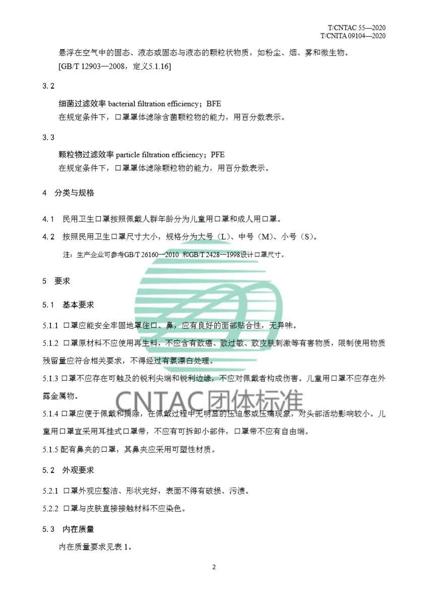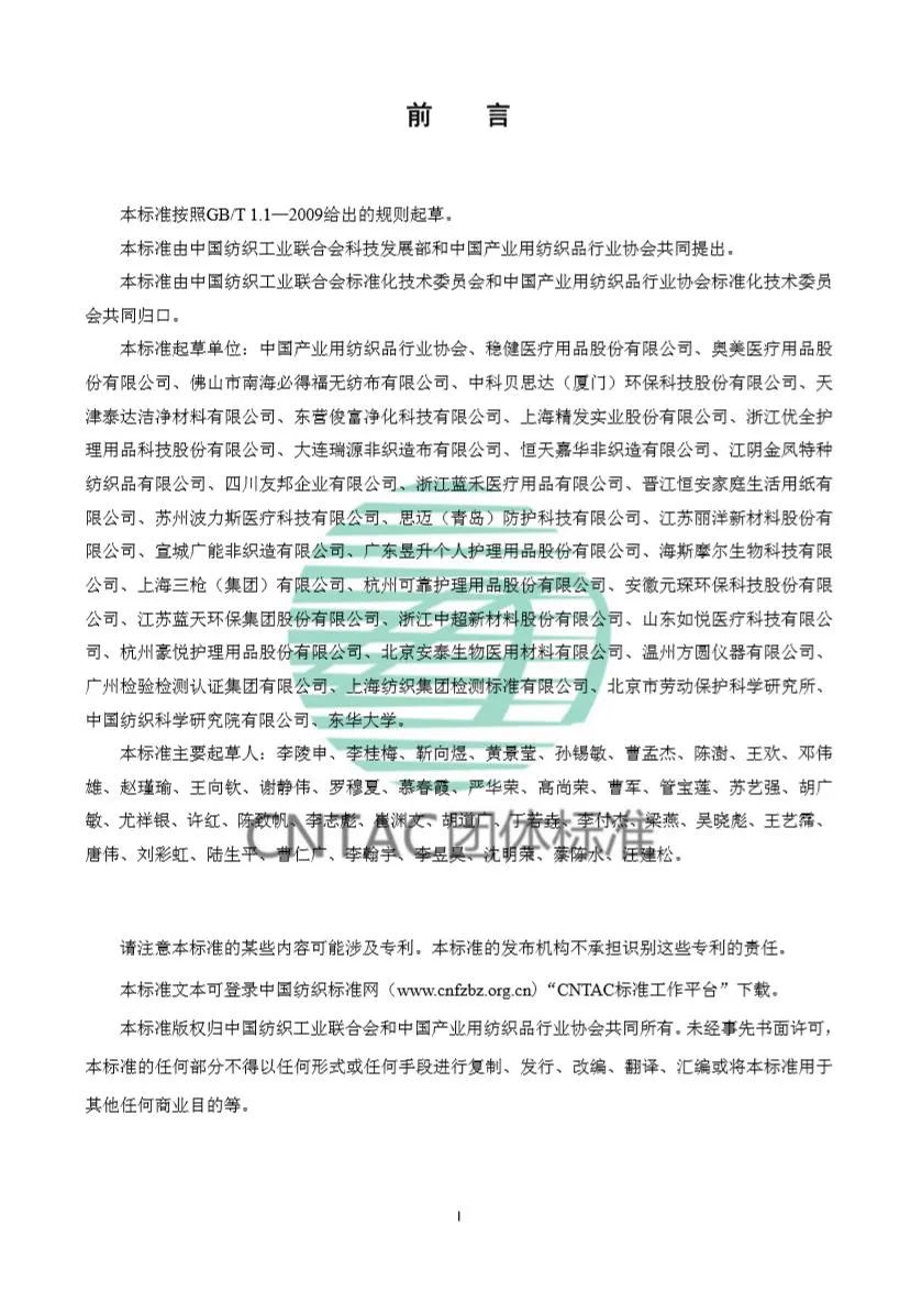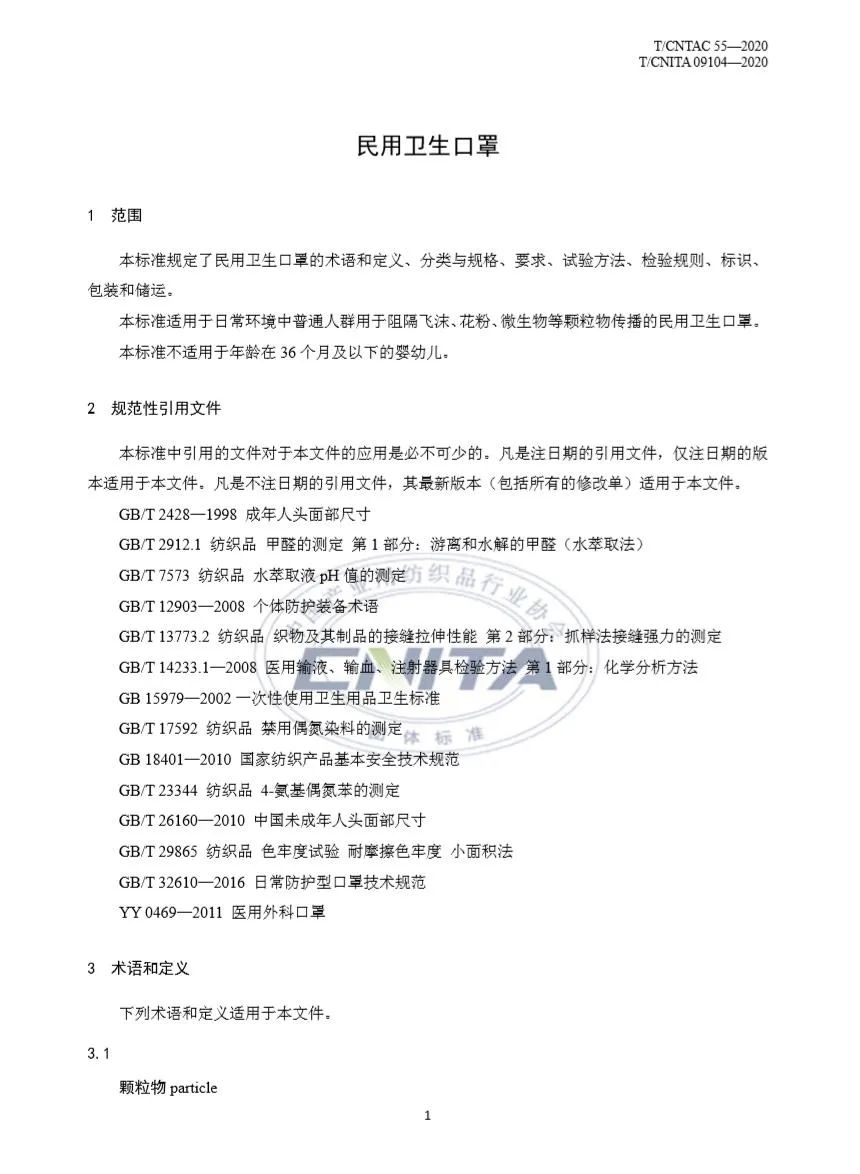 《民用衛(wèi)生口罩》的編制團隊 起草單位涵蓋口罩研發(fā)、生產(chǎn)、材料、檢測、管理全產(chǎn)業(yè)鏈。專家團隊來自行業(yè)協(xié)會、口罩生產(chǎn)企業(yè)、材料生產(chǎn)企業(yè)、醫(yī)療器械使用單位、科研院所及檢測單位。 起草單位名單:中國產(chǎn)業(yè)用紡織品行業(yè)協(xié)會、穩(wěn)健醫(yī)療用品股份有限公司、奧美醫(yī)療用品股份有限公司、佛山市南海必得福無紡布有限公司、中科貝思達(廈門)環(huán)保科技股份有限公司、天津泰達潔凈材料有限公司、東營俊富凈化科技有限公司、上海精發(fā)實業(yè)股份有限公司、浙江優(yōu)全護理用品科技股份有限公司、大連瑞源非織造布有限公司、恒天嘉華非織造有限公司、江陰金鳳特種紡織品有限公司、四川友邦企業(yè)有限公司、浙江藍禾醫(yī)療用品有限公司、晉江恒安家庭生活用紙有限公司、蘇州波力斯醫(yī)療科技有限公司、思邁(青島)防護科技有限公司、江蘇麗洋新材料股份有限公司、宣城廣能非織造有限公司、廣東昱升個人護理用品股份有限公司、海斯摩爾生物科技有限公司、上海三槍(集團)有限公司、杭州可靠護理用品股份有限公司、安徽元琛環(huán)保科技股份有限公司、江蘇藍天環(huán)保集團股份有限公司、浙江中超新材料股份有限公司、山東如悅醫(yī)療科技有限公司、杭州豪悅護理用品股份有限公司、北京安泰生物醫(yī)用材料有限公司、溫州方圓儀器有限公司、廣州檢驗檢測認證集團有限公司、上海紡織集團檢測標準有限公司、北京市勞動保護科學研究所、中國紡織科學研究院有限公司、東華大學 標準文本如下: