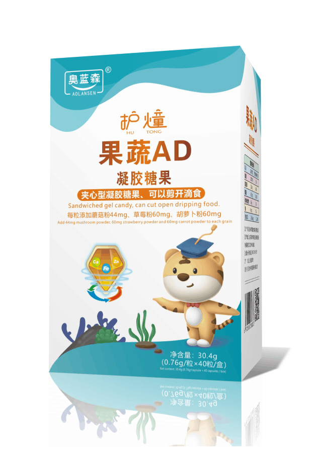 奧藍(lán)森護(hù)燑果蔬AD凝膠糖果 夾心型凝膠糖果,可以剪開滴食 每粒添加蘑菇粉44mg、草莓粉60mg、胡蘿卜粉60mg