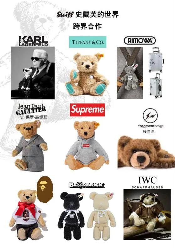 得到父母的認(rèn)可是成為孩子心愛玩具的第一步,當(dāng)史戴芙Steiff得到了爸爸媽媽們的喜愛,進(jìn)入大眾視野的兒童系列和嬰兒系列就有了廣闊的市場基礎(chǔ)。史戴芙Steiff在兒童系列里都采用了柔軟、耐用、防過敏的高品質(zhì)安全面料(專門針對3到14歲的兒童群體研發(fā));而嬰兒系列則是從寶寶出生的那一刻就可以使用,大多采用了純棉或有機(jī)棉的材質(zhì),就連眼睛也都換成了刺繡工藝,以確保寶寶的安全。這部分產(chǎn)品跟收藏者系列有很大不同,產(chǎn)品更強(qiáng)調(diào)柔軟、親膚、舒適性,造型也更加童趣可愛,每年有近400個(gè)品種可供售賣,價(jià)位也更加親民。 除此之外,史戴芙Steiff有很多被大家所熟識的跨界合作,很多和史戴芙Steiff擁有相同消費(fèi)群體定位的品牌都愿意攜手合作,打造帶有雙方特色的史戴芙Steiff泰迪熊,不管是和奢侈老牌路易威登、Tiffany、IWC萬國的合作,還是與時(shí)尚潮牌藤原浩、BAPE、Supreme的聯(lián)名,都讓史戴芙Steiff在更多不同年齡段的消費(fèi)群體心中留下了深刻印象。