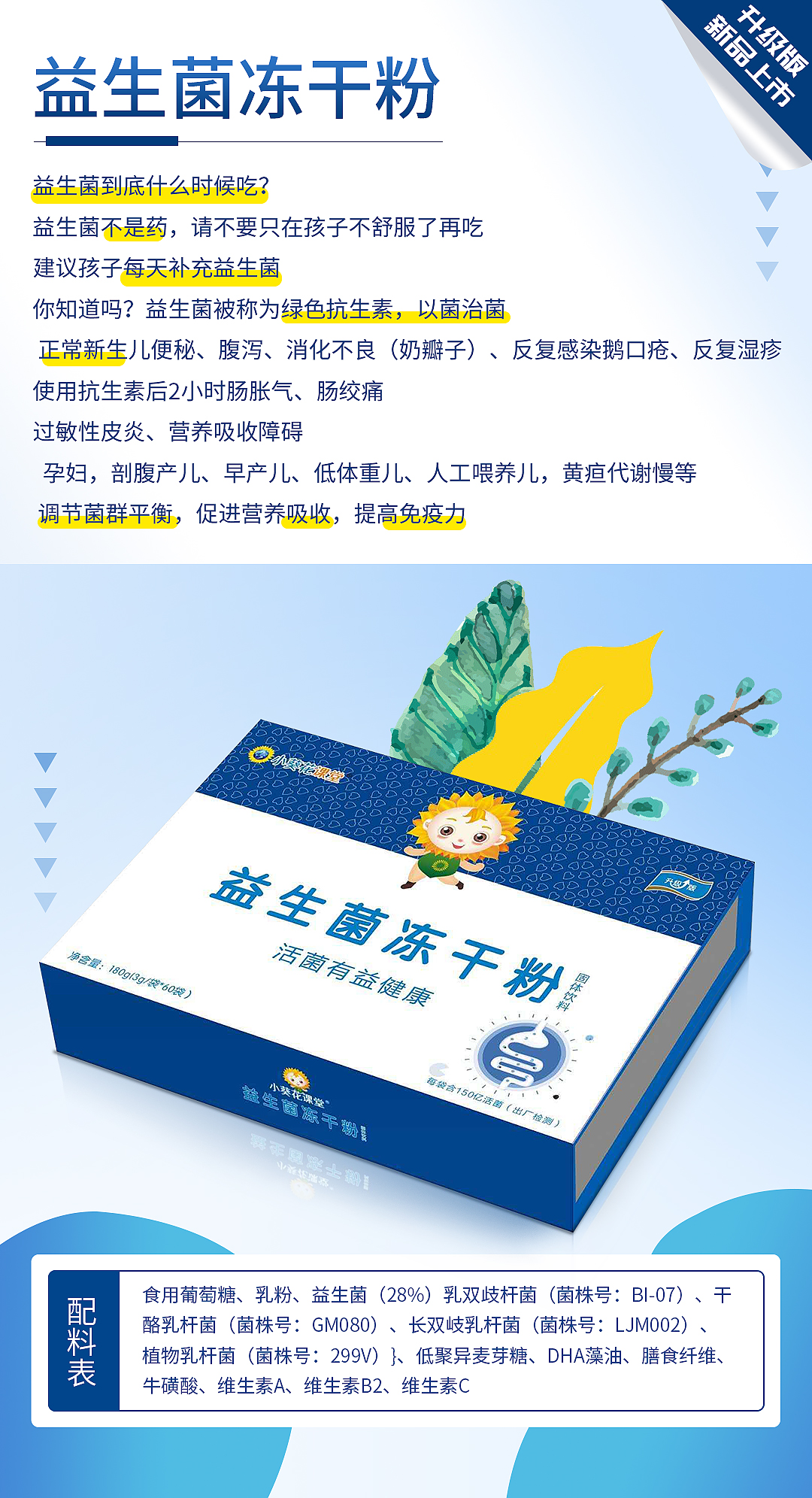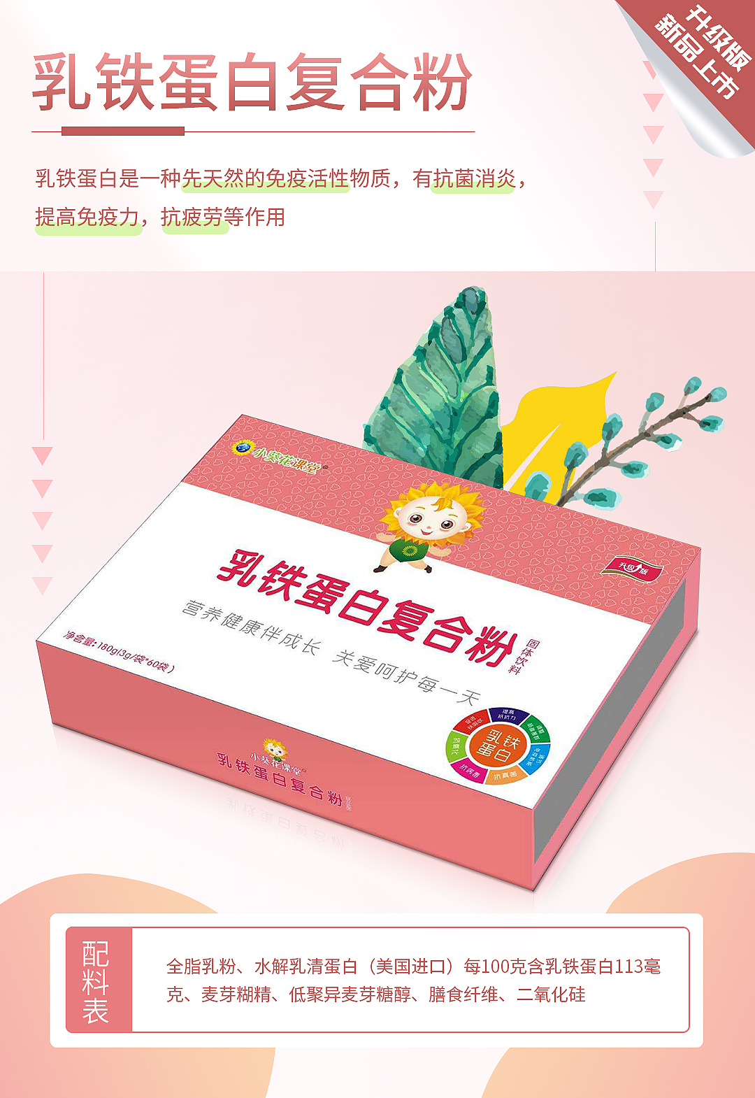 終端熱賣爆款,為圓千萬孩子一個“長高夢”而來!該品富含多種營養元素,如磷酸氫鈣、葡萄糖酸鋅、雞內金、牛磺酸、L-賴氨酸等,更搭配多種維生素,如維生素B1、B2、B12、B6,維生素C及維生素D3,配比更科學,營養更全面,經嚴格工藝加工而成,層層監督檢測,確保品質,助力成長健康,讓每個孩子都能贏在起跑線上! 小葵花課堂升級版乳鐵蛋白復合粉