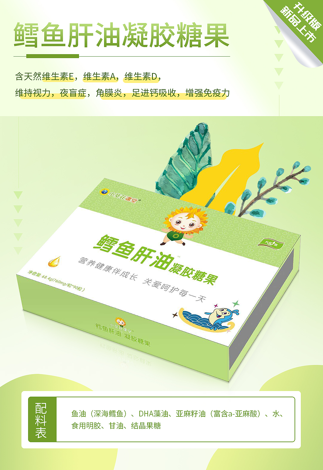 小葵花課堂升級版DHA藻油凝膠糖果 想要孩子擁有好智力、好視力,優質營養不能少,而“DHA”則是不可缺少的重要營養素!該品優選深海藻類為原料,未經食物鏈污染,品質純凈,更特別添加葵花籽油(甾醇、維生素、亞油酸等)、亞麻籽油(富含a-亞麻酸)、微晶纖維素、甘油等,以精湛工藝制作而成,DHA含量更高,每粒含DHA藻油180mg,無腥味,易消化吸收,助力好成長! 小葵花課堂升級版鱈魚肝油凝膠糖果