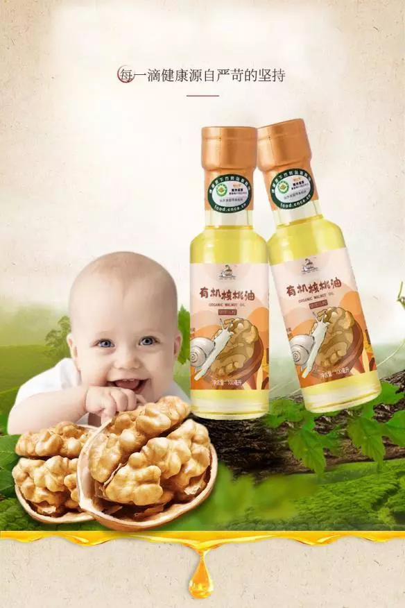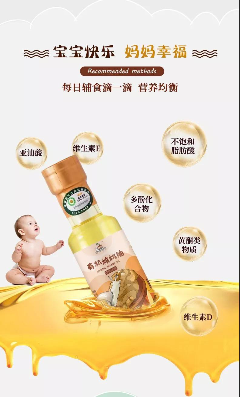有機核桃油 寶寶有機核桃油是專為3個月至3歲嬰幼兒研制的一種營養品。寶寶核桃油含多種天然維生素、微量元素及人體所需脂肪酸,幫助寶寶大腦神經、視覺、記憶等全面發育。 核桃油的功效作用