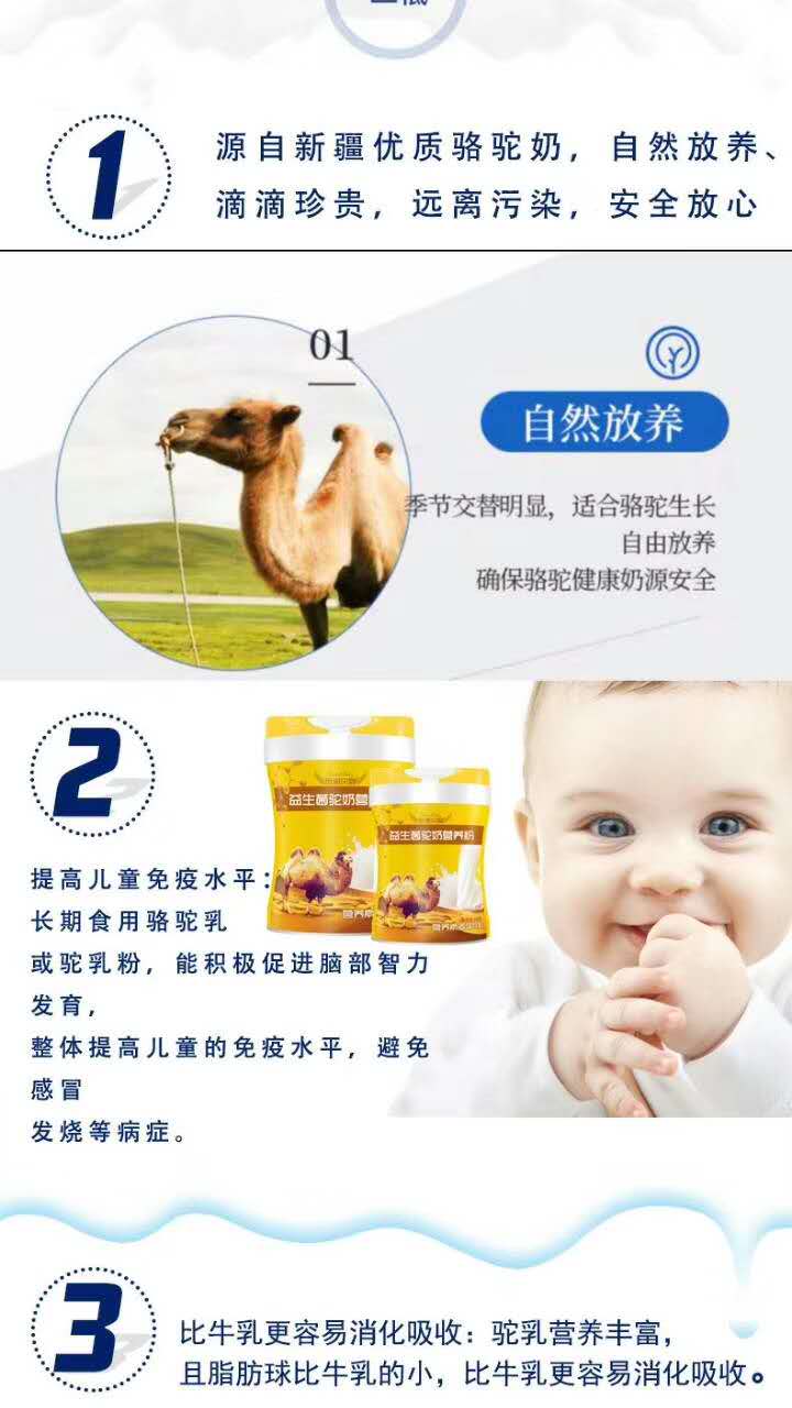 乳糖不耐受人群福音(駱駝不含過敏源,駝奶乳糖含量極低) ️糖尿病人一定要喝的奶(每毫升富含52個微單位的胰島素因子) ️有助于小朋友生長發(fā)育和智力發(fā)育(鈣含量是牛奶的10倍)
