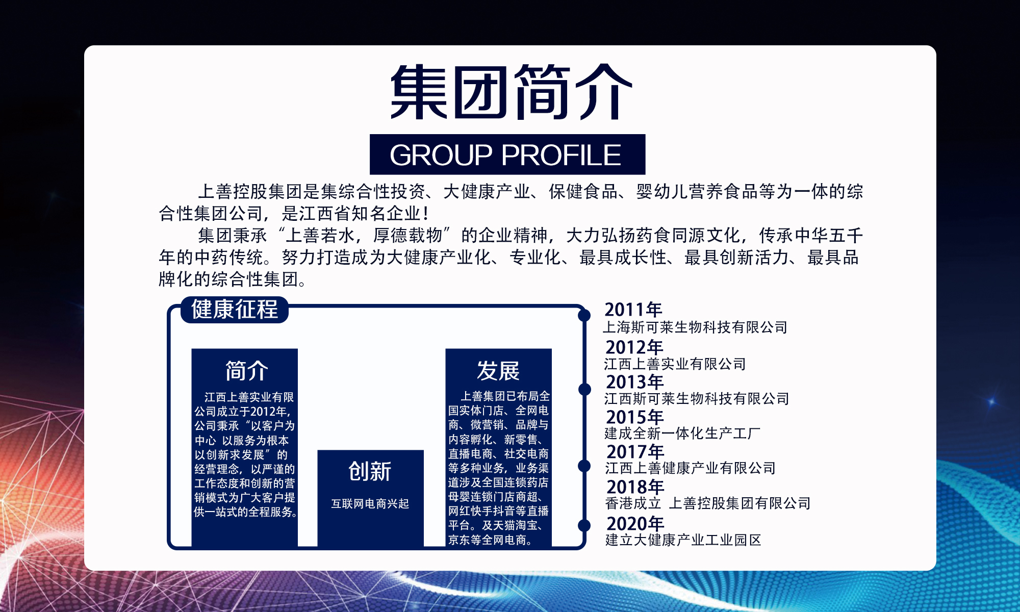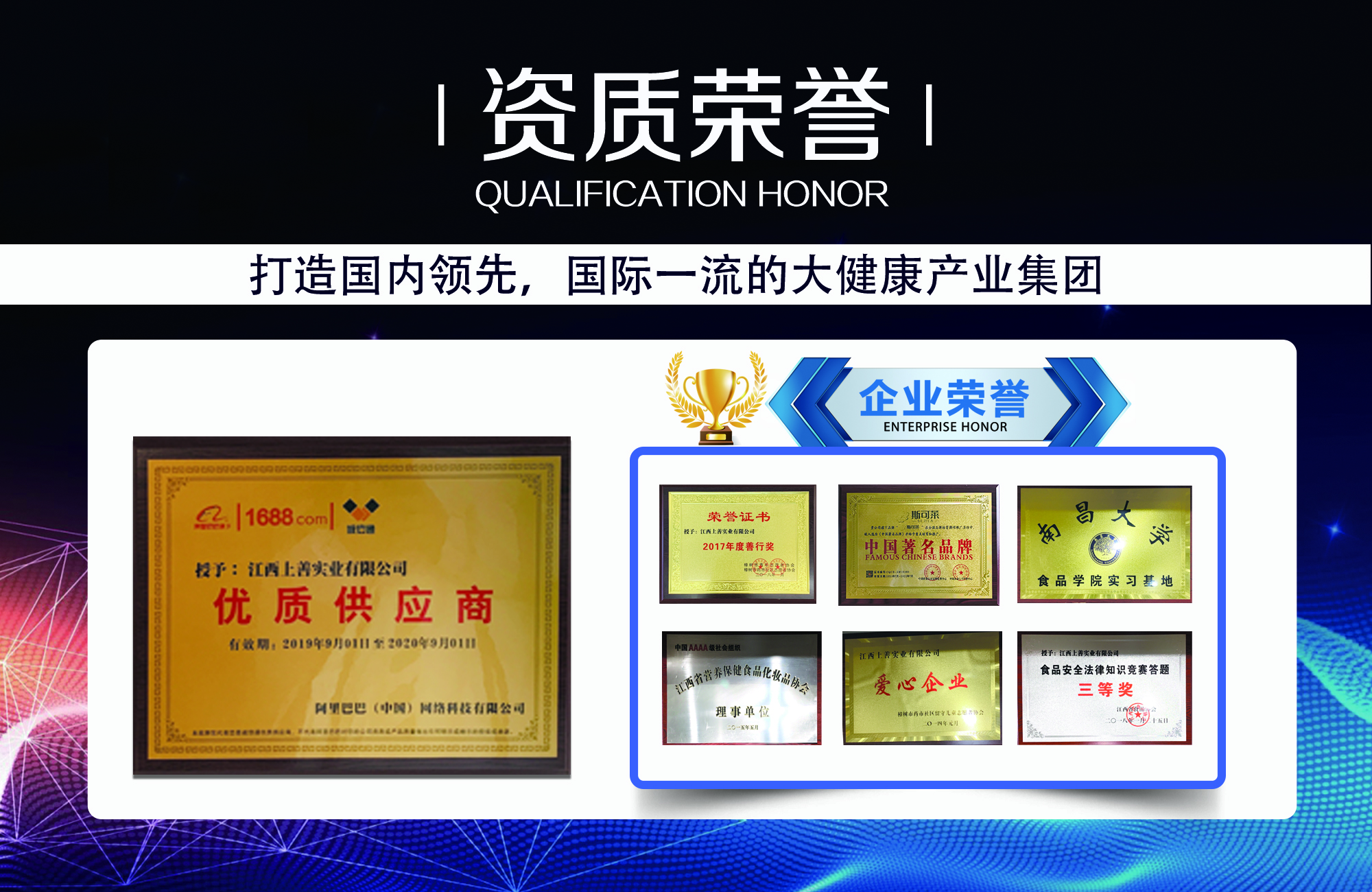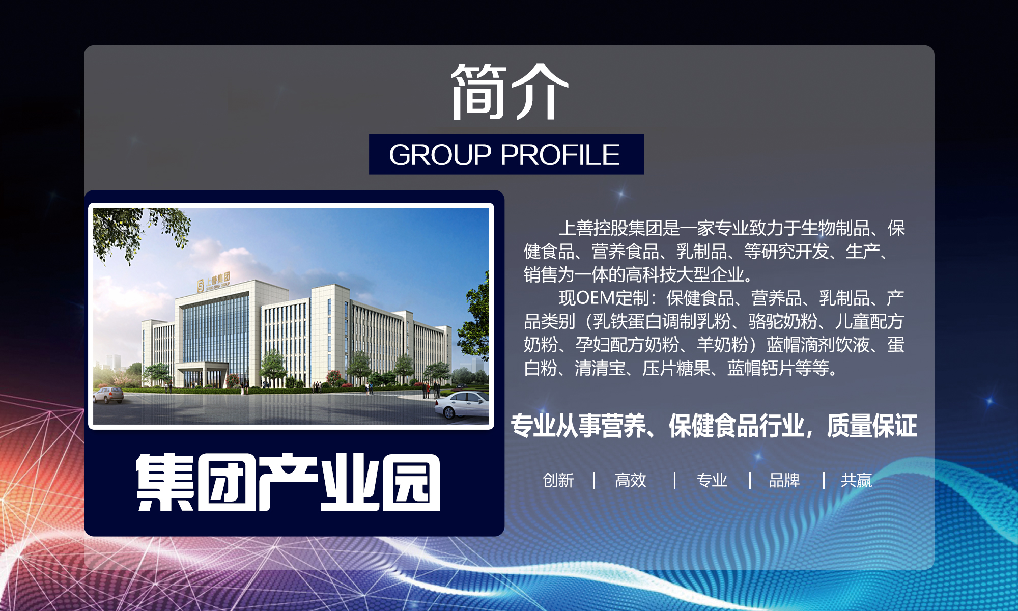 江西上善集團 保健營養食品研發生產企業! 10萬級GMP無塵生產車間,與南昌大學食品工程學院聯合研發生產。資質俱全 專業承接各類OEM食品/保健食品代加工項目。包含保健食品,粉劑,顆粒、壓片糖果、粉劑,口服液、代用茶。我們有專業的研發團隊為您量身定制產品,專業的生產工廠為您塑造暢銷品種,專業的物流團隊為您的運輸保駕護航!我們的競爭優勢就是一站式服務,讓您安枕無憂!我們的宗旨就是:把控每一步的質量環節,用我的行動換取您的信任與支持,全身心投入到市場開發的浪潮,為合作伙伴騰飛做出一點點貢獻! 合作:微商 會銷 電商 藥店 孕嬰店 商超及健康管理企業一條龍服務定制! 找產品 代工產品,上善集團為您制作一切所需所想,免去您建廠、研發、生產、等金額的投資風險!我們期待著與您的合作! 咨詢電話/微信:楊18979585253