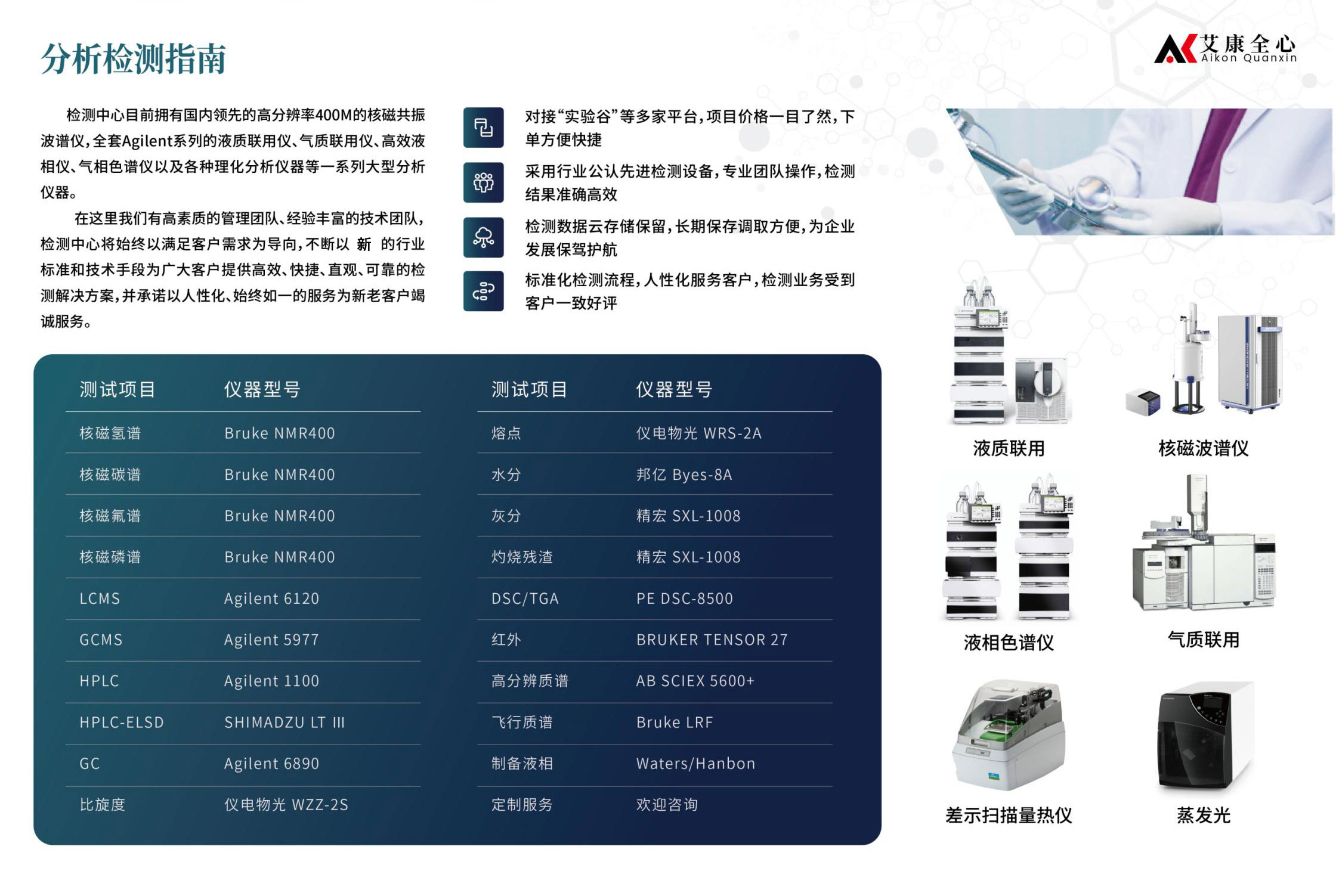 南京 化工原料檢測成分(艾康全心)_專業檢測中心_分析檢測實驗室 艾康全心分析檢測中心提供專業成分分析化學分析,化學分析測試,配方檢測等服務,可開展化學化工品,工業材料的成分分析.憑借多年化工品成分分析經驗提供準確的分析報告,檢測中心目前擁有國內較好高分辨率400M的核磁波譜儀,全套Agilent系列的液質聯用、氣質聯用、高效液相、氣相色譜等一系列大型分析儀器。 服務項目: 一、核磁共振波譜儀測試: 1H、13C、19F、31P等一維譜圖,實驗室常備二甲亞砜-d6、 氯仿-d、重水、 甲醇-d4,提供5mm標準核磁測試管。 二、液質聯用、氣質聯用測試: 食品安全、農獸藥殘留、有毒有害物質、藥物雜質、有機污染物以及生物樣品的定性分析;合成反應進程監控、主副產物及中間體分析、化學反應歷程和機理研究;臨床藥物濃度監測、新藥質量標準制訂以及藥代動力學研究。 三、氣相色譜測試: FID檢測器,峰面積歸一化法百分含量測定;內標、外標法定量分析(需客戶提供標準物)。
