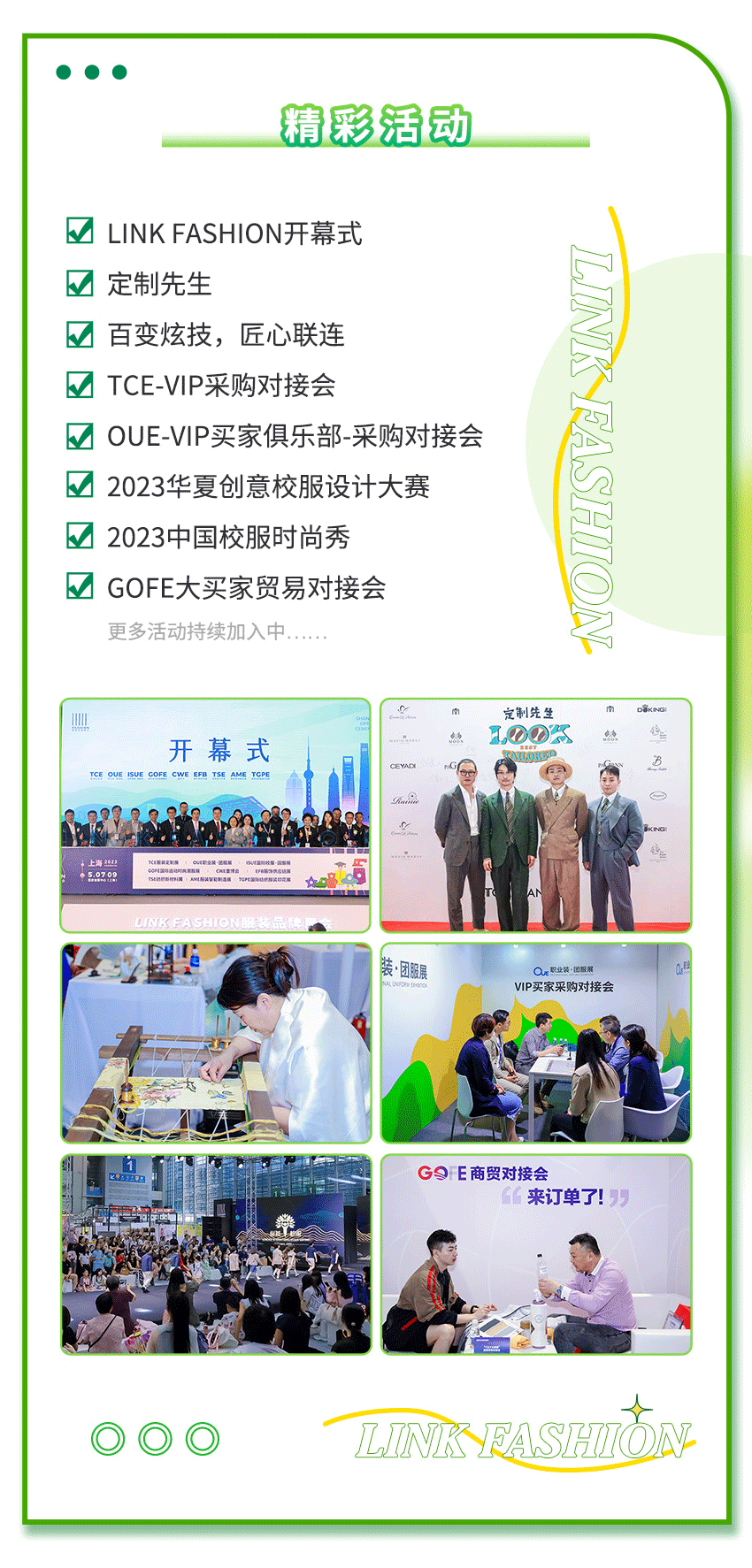 以展帶賽,以展帶會,會展賽三結合,多年來,LINK FASHION早已成長為集展覽展示、技術交流、時尚走秀、商貿配對于一體,服務和助力行業發展的多層面立體化盛會,每屆展會期間舉辦的同期活動,也為不少行業同仁所期待。本屆成都展現場的一系列精彩活動同頻共振,將讓展會的參與者沉浸在多元話題與商貿達成之中。