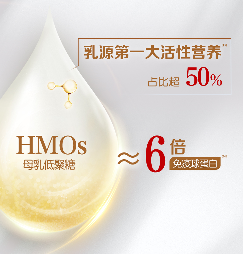 HMO奶粉有用嗎?金領冠用產品回答消費者。其推出的首款[1]HMOs[2]奶粉珍護鉑萃,科學復配5種HMOs,并特別添加2倍超級[3]三代OPO,配合雙重活性益生菌+益生元組合,助力寶寶防護力和吸收力全面進階。此外,金領冠珍護鉑萃還搭配有95%[4]高純度乳鐵蛋白,1/20000的珍稀[5]精萃,可有效減少25%[6]寶寶肚肚和呼吸道不適;同時添加的活性蛋白OPN[7]是核心免疫蛋白,占母乳總蛋白質含量的10%[8]以上,與乳鐵蛋白雙效協同作用,實現1+1>2的卓越防護效果,成為新世代寶爸寶媽提升免疫力的奶粉首選。 [1] 首款:指金領冠首款 [2] HMOs:指珍護鉑萃3段產品中含有的3'-唾液酸乳糖、6'-唾液酸乳糖、3'-半乳糖基乳糖、6'-半乳糖基乳糖、3-巖藻糖基乳糖5種營養成分,根據相關研究,母乳低聚糖中包含了上述成分,參考文獻:蔭士安.人乳成分——存在形式、含量、功能、檢測方法.2021.7;DavidS Newburgetal. JNutr.2016Feb. [3] 2倍超級:2倍指珍護鉑萃3段產品中OPO的含量約為國標下限的2倍;超級指對比金領冠其他產品配方 [4] 95%:數據來源于供應商 [5] 珍稀:數據來源于供應商,每20000g鮮奶僅能提取1g乳鐵蛋白 [6] 25%:中國營養學會婦幼營養分會,乳鐵蛋白嬰幼兒健康效應專家共識,臨床兒科雜志,2018年第36卷第11期;The application of lactoferrin in infant formula:The past, present and future, Li,2022. [7] 活性蛋白OPN:骨橋蛋白(osteopontin),源自乳清蛋白粉 [8] 10%:萌士安.人乳成分--存在形式、含量、功能、檢測方法 |
