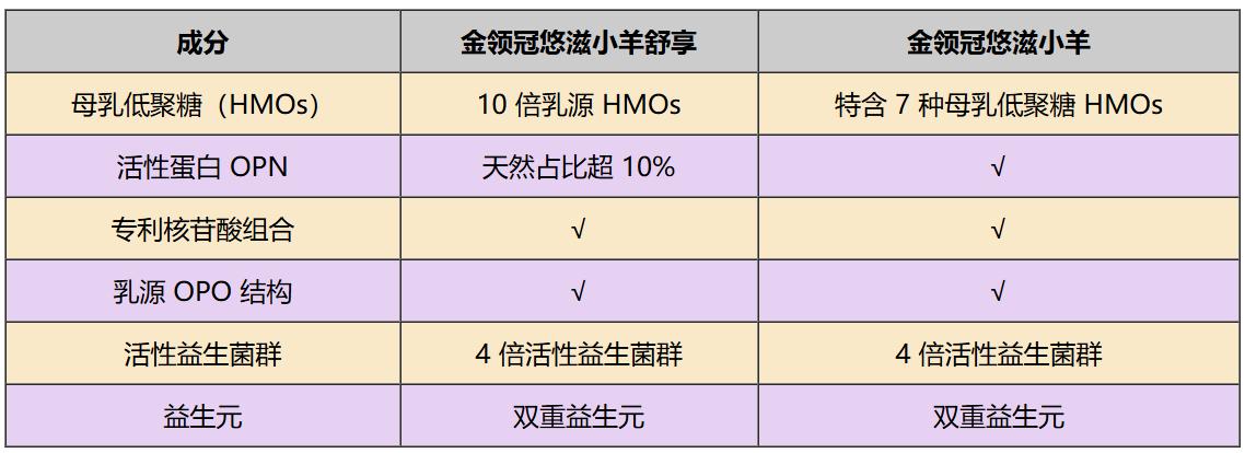 配方:科學(xué)配比,打造全方位成長守護(hù) 在配方創(chuàng)新方面,兩款產(chǎn)品各具特色。金領(lǐng)冠悠滋小羊舒享以母乳研究為藍(lán)本,含有10倍[8]乳源HMOs[9](母乳低聚糖),能有效激發(fā)寶寶免疫球蛋白sIgA倍增,構(gòu)建腸道防御屏障,減少病菌感染風(fēng)險(xiǎn)。值得一提的是,金領(lǐng)冠悠滋小羊舒享中的乳鐵蛋白純度高達(dá)95%[10],能有效激活防護(hù)細(xì)胞,減少呼吸系統(tǒng)不適和肚肚不適,成為寶寶的保護(hù)力“外掛”。金領(lǐng)冠悠滋小羊則特含7種母乳低聚糖HMOs,幫助腸道降低有害菌黏附,守護(hù)腸道健康。 此外,活性蛋白OPN[11]與專利核苷酸組合[12]的加入,進(jìn)一步強(qiáng)化了產(chǎn)品配方的協(xié)同效應(yīng)。OPN作為初乳核心免疫蛋白,天然占比超10%[13],與乳鐵蛋白形成“雙活性CP”,協(xié)同提升寶寶自護(hù)力,讓營養(yǎng)吸收更高效。 對(duì)于新生兒來說,腸胃功能尚未發(fā)育完全,消化系統(tǒng)較為脆弱,因此許多寶寶在成長初期容易出現(xiàn)消化不適的癥狀,如脹氣、便秘或腹瀉等。針對(duì)這一常見問題,金領(lǐng)冠悠滋小羊舒享和金領(lǐng)冠悠滋小羊都進(jìn)行了精心的配方設(shè)計(jì):科學(xué)配比乳源OPO結(jié)構(gòu)脂、4倍[14]活性益生菌群以及雙重[15]益生元黃金組合,這些成分相互協(xié)同,能夠有效調(diào)節(jié)腸道菌群,促進(jìn)營養(yǎng)吸收,減少寶寶腸胃不適,讓寶寶的小肚肚更舒適,助力健康成長。