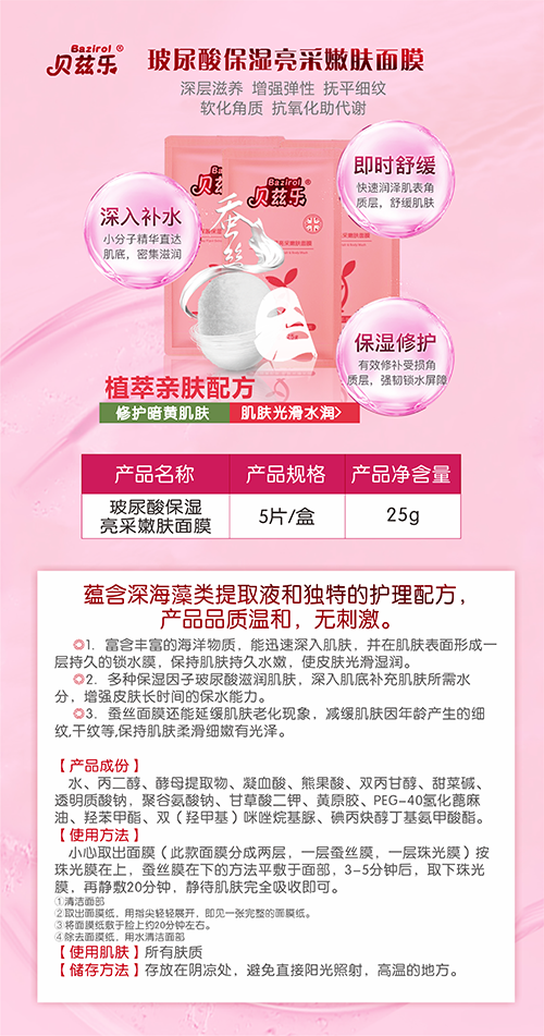 貝茲樂玻尿酸保濕嫩膚蠶絲面膜