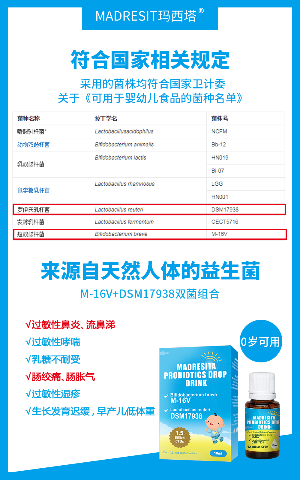 瑪西塔益生菌滴液飲品,所含菌種短雙歧桿菌M-16V、羅伊氏乳桿菌DSM17938,均為國家規定兒童專用菌株,且都來源于人體,活性強,穩定性高,定植率高,不添加激素、防腐劑、人造香精等,每5滴含15億高活性益生菌,有效緩解嬰幼兒過敏性鼻炎、流鼻涕、腸絞痛、腸脹氣、過敏性哮喘、過敏與濕疹、乳糖不耐受、生長發育遲緩、早產兒低體重等癥狀!