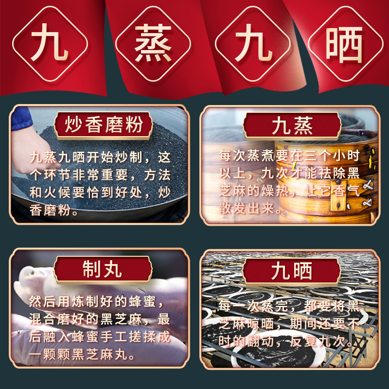 【配料】黑芝麻、黑豆 、黑米、核桃仁、桑葚、黃精、黑棗、蜂蜜