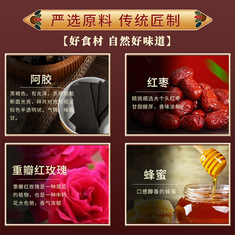 【配    料】阿膠、重瓣紅玫瑰、姜、紅棗、紅糖、白砂糖、蜂蜜